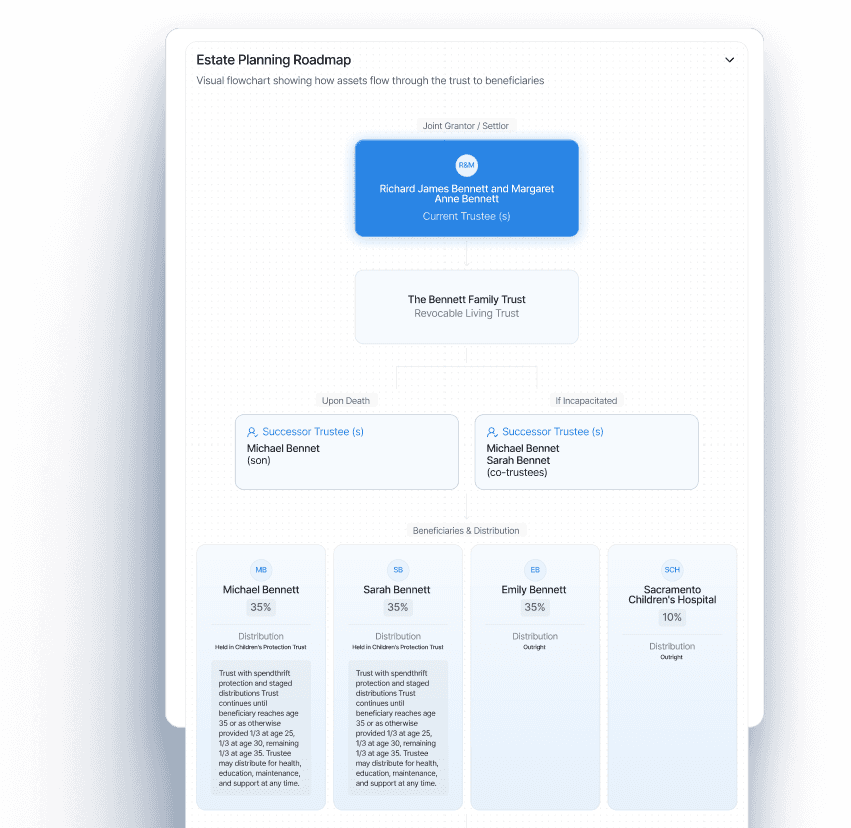 Visualizing the full lifecycle of the trust, mapping out grantor roles, successor triggers, and final distribution methods in one unified view.