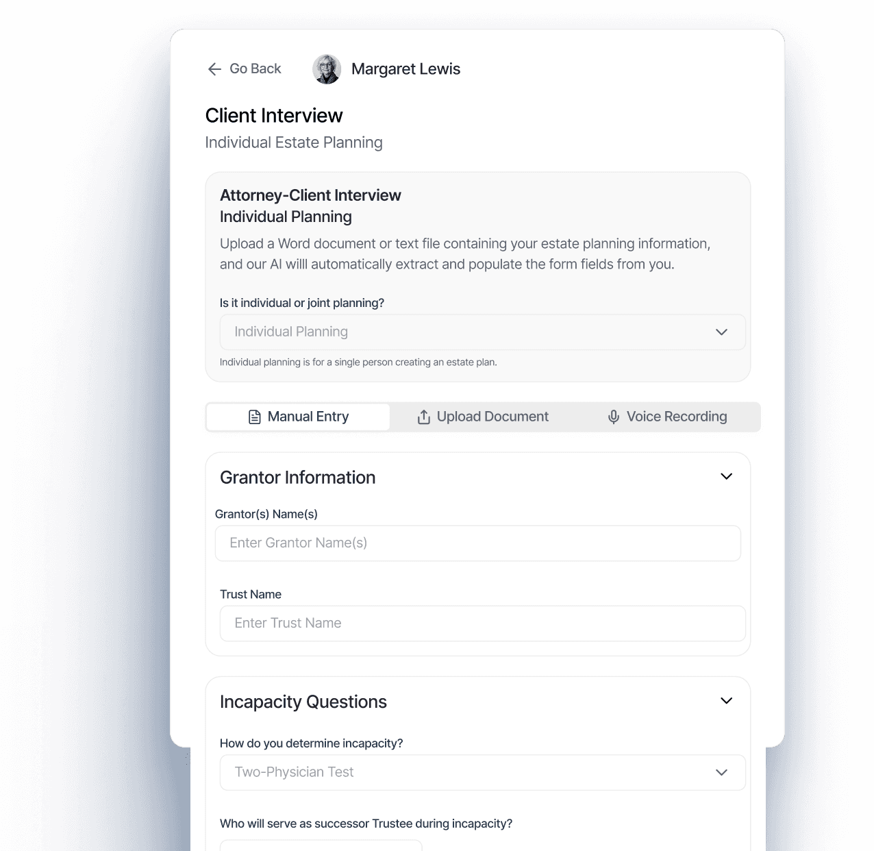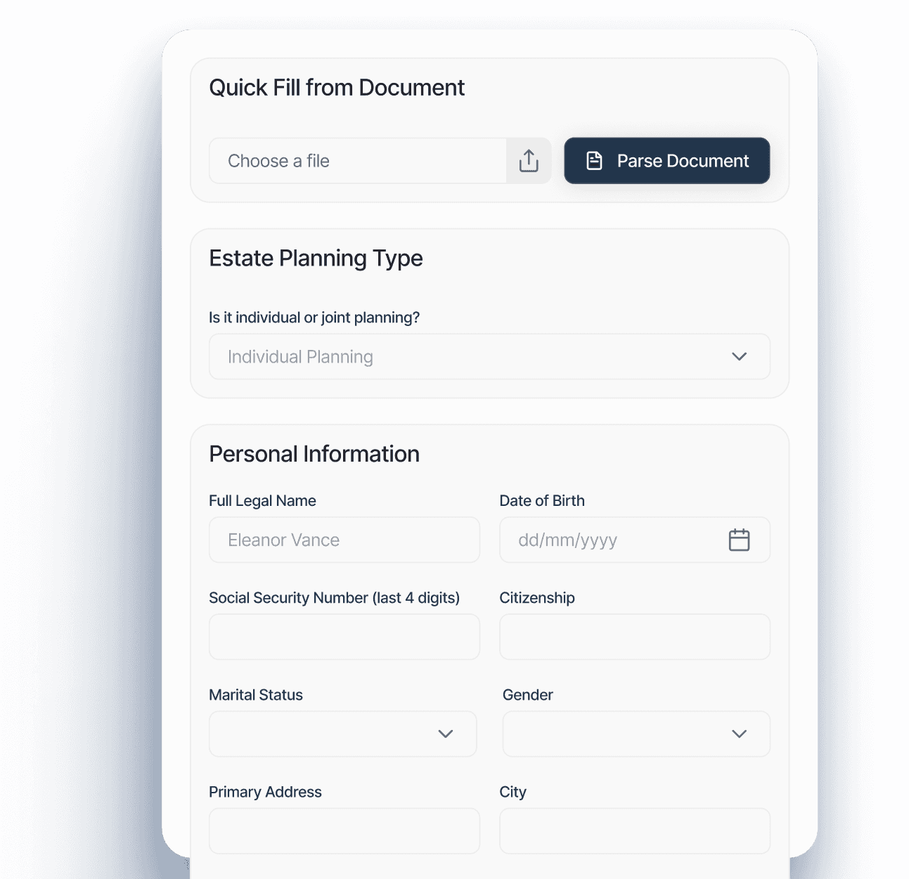 Upload a Word document or text file containing your estate planning information, and our AI willl automatically extract and populate the form fields from you.