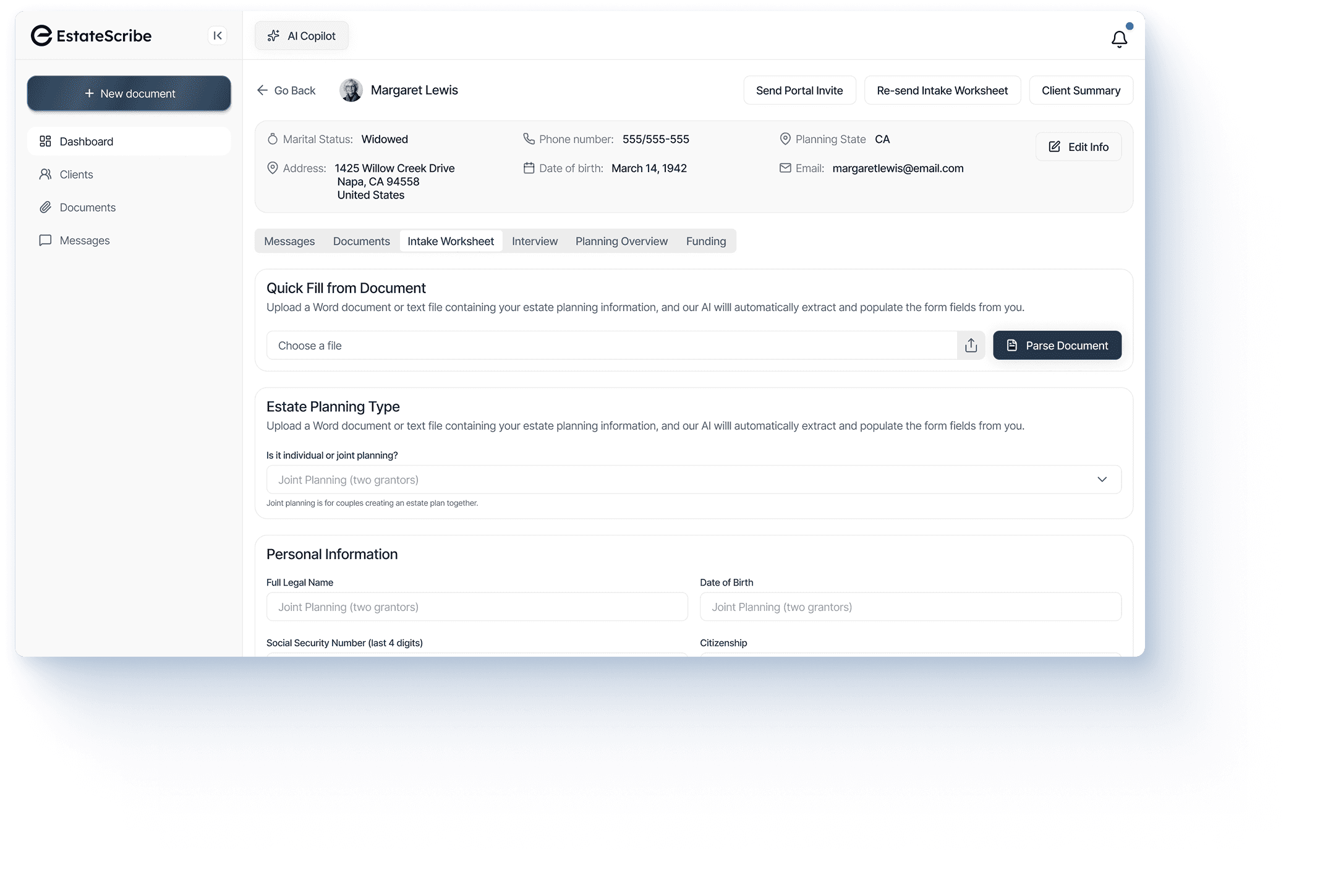 EstateScribe brings automated, jurisdiction-specific drafting together with organized client data management and a secure, fully white-labeled client portal, transforming intake and attorney-guided interviews into completed estate planning documents in minutes while enabling seamless collaboration and keeping attorneys firmly in control of review, judgment, and final approval.
