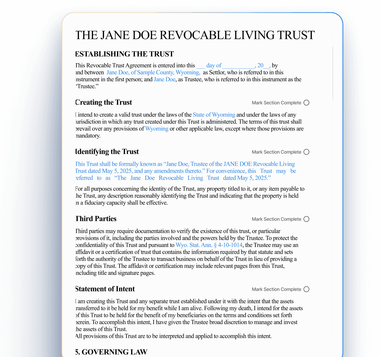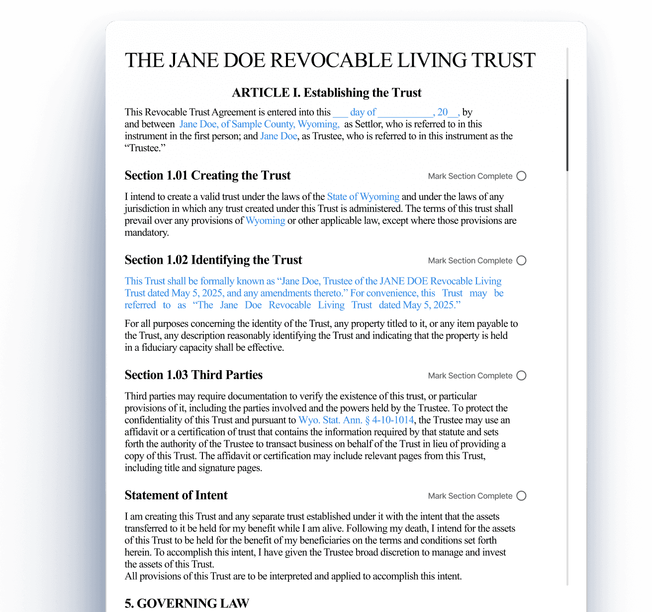 I hereby intend to establish a legally binding trust in accordance with the laws of the State of Wyoming and any other jurisdiction where this Trust may be administered. The provisions of this trust shall take precedence over any conflicting terms.