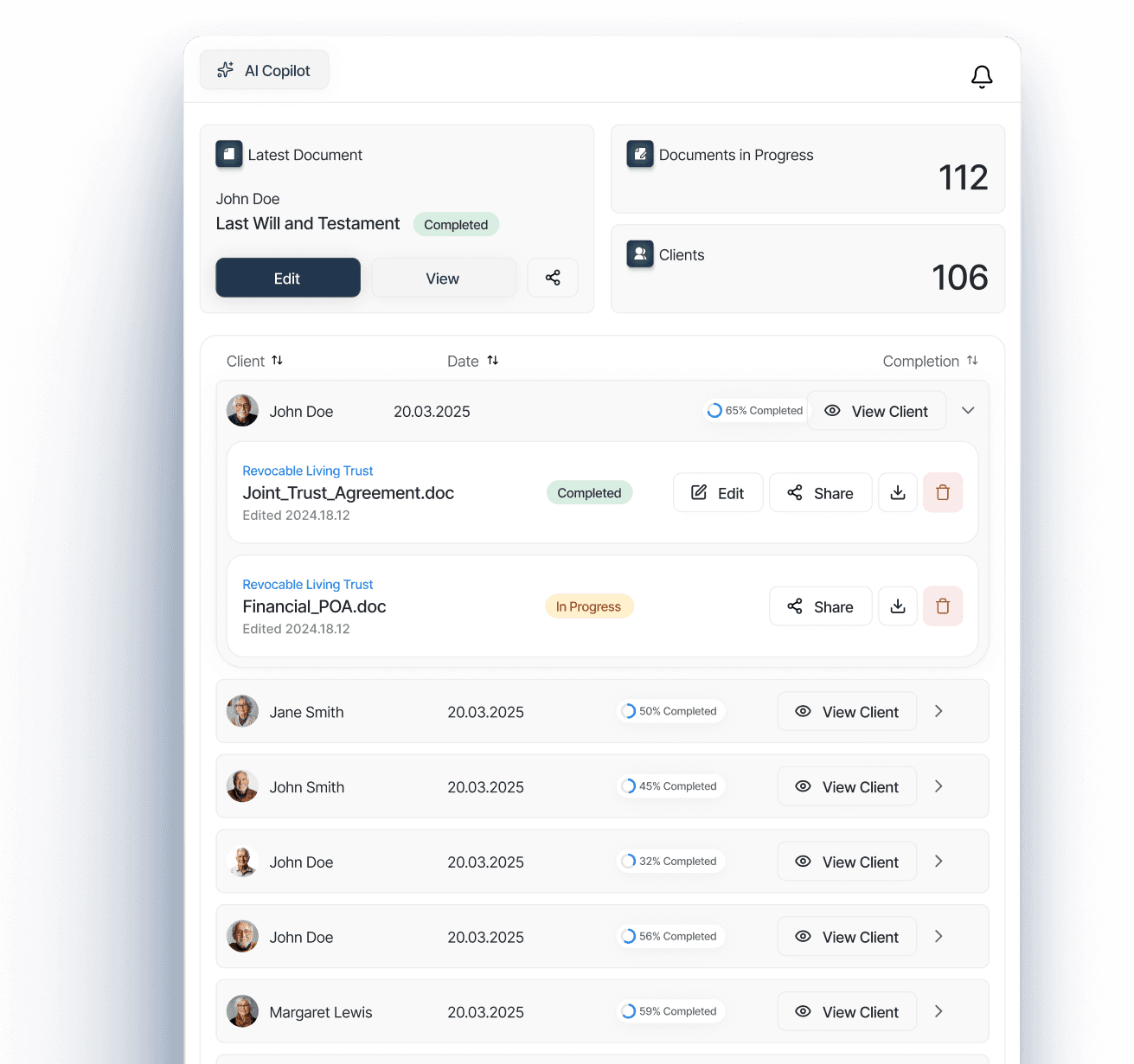 Monitor the progress of each matter with visual dashboards that show completion status, upcoming deadlines, and outstanding tasks for your team and clients.