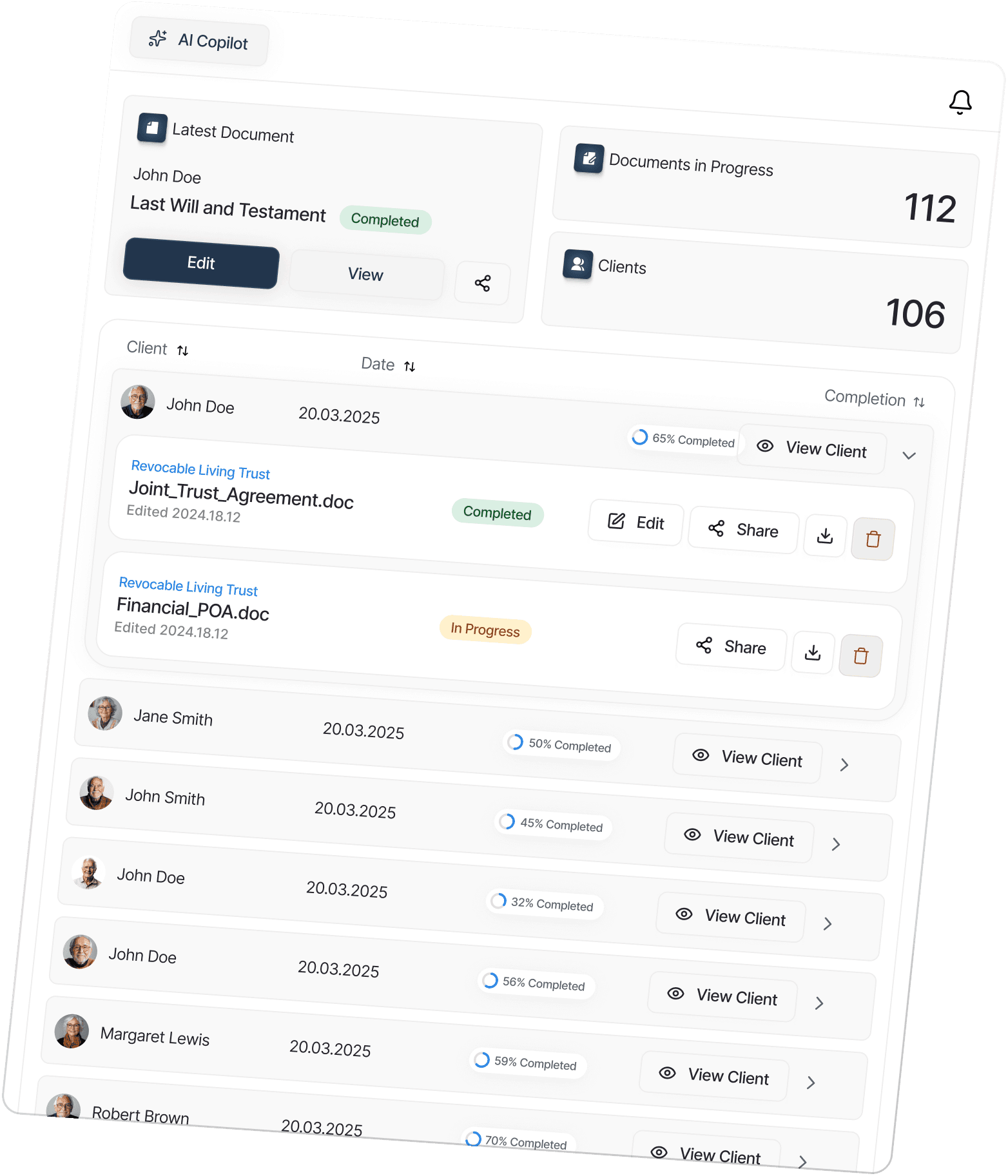 At EstateScribe: client intake and onboarding are designed to work as a single, seamless flow. Clients enter their information once through a secure portal, and that data moves directly into the attorney view without manual effort.